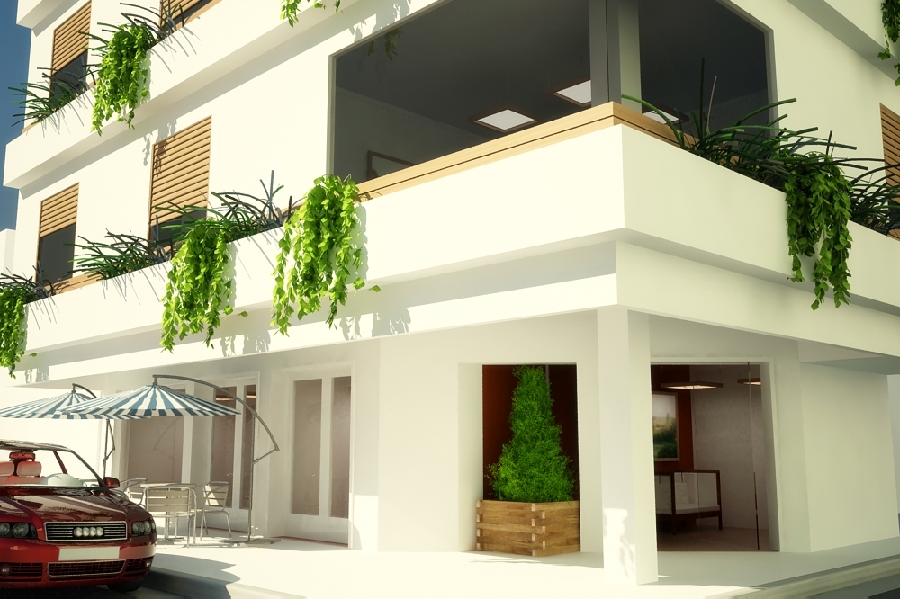 Hola, yo veo varios problemas básicos. El primero las texturas de fachada y acera, que le dan un aspecto irreal, otro las persianas, que no pueden ir ahí, debes retranquearlas más adentro y el tercero los palos de la vegetación, que te han quedado pelín gigantescos, también reduciría el tamaño de las hojas de las plantas.