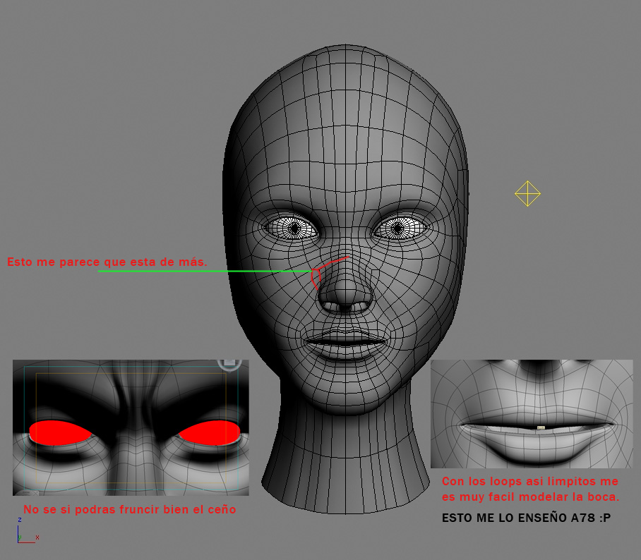 Antes de nada gracias por las molestias, lo de la nariz que marcas es el cambio de sentido que te comentaba, está hecho para no cargar más los polígonos del ojo, no creo que me llegue a dar ningún problema, los polígonos de la boca he cargado tanto porque necesito más volumen en esos labios y le he hecho una doble línea en la parte superior del labio superior y otra en la parte inferior del labio inferior para marcar esos labios. Todos los polígonos o cortes que suelo meter van justificados, no suelo meter cortes innecesarios, en el caso de que vea que lo de la nariz me puede dar problemas, continuare ese corte hasta el ojo, pero por el momento lo dejare así, más que nada porque no creo que me de problemas. De todos modos, gracias.