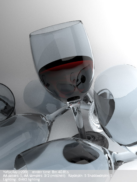 Estaba pensando en que para animación esto sería inaceptable por tiempos de render, quizás para hacer un ajuste mejor en la velocidad del render tendríamos que optar por otro tipo de material que no fuese el Glass por defecto de Yafray. Espero no haber dicho muchas tonterías. Gracias por saturarme.