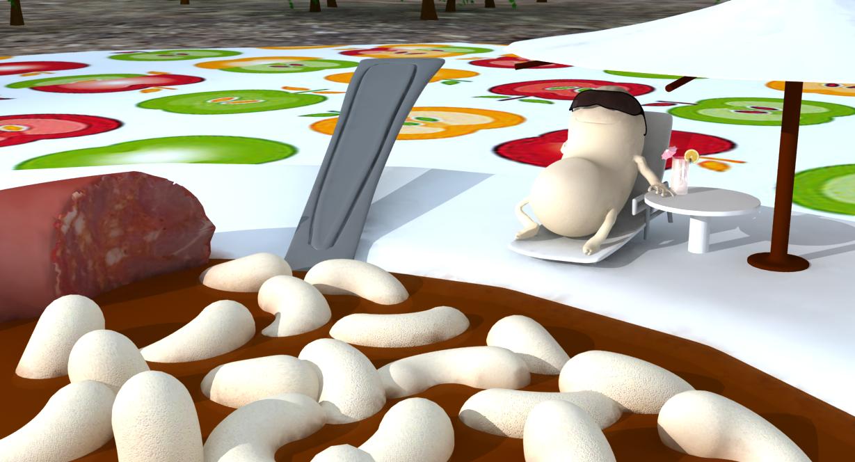 La cuchará la haría plateada, al plato le pondría un poco de reflexión y especulares. El chorizo lo haría con un cilindro y le pondría una textura en la que se vieran las marcas del tocino, vamos lo que es una rodaja de chorizo cortado. Y luego si se viera que está encima de un mantel a cuadros eso ayudaría a entender qué es un plato de comida.