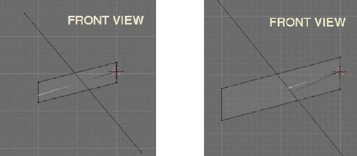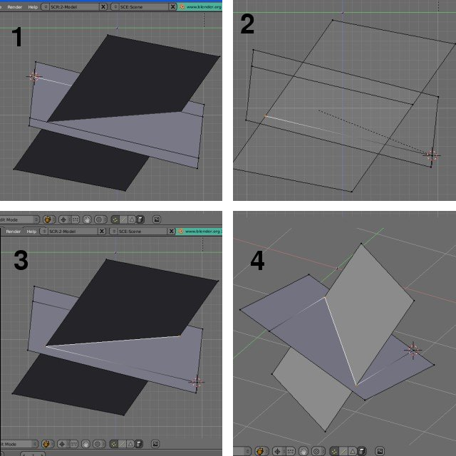 1.7. Comenzamos con un objeto simple en Edit Mode. Éste consistirá en dos planos que se intersectan entre sí (fig. 7). Luego en vista ortográfica lateral (numérico 3) proyectamos los bordes de un plano sobre el otro cómo se describe en el párrafo 1.4 (fig. El vértice izquierdo del borde superior es el 1er, pivote para escalar los vértices dos veces, uno para el borde izquierdo y otro para el derecho. Lo mismo para el 2º pivote. Unimos los vértices que hemos calculado por los bordes. Figura 8. Proyecciones de los bordes de los planos entres sí.