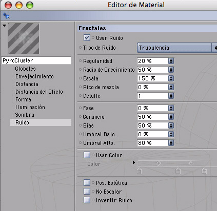 Vamos a crear los materiales para nuestro emisor de partículas. En la ventana de materiales (archivo > Shader > Pyrocluster) este será el Shader para las partículas por lo tanto se lo aplicamos a nuestro emisor, y en (archivo > Shader > Pyrocluster - Volumetracer) será el Shader que nos dará los valores de render del Pyrocluster, para lo cual añadimos un objeto entorno (objetos > escena > entorno) y le aplicamos el volumetracer.