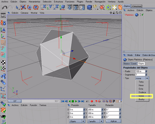 Seleccionamos el objeto y, dentro de la pestaña objeto, elegimos tipo = icosaedro.