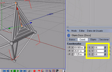Seleccionamos el disco, en la escala del objeto asignamos el valor 0,6 a s.x, s y, z, para que se ajuste el triángulo a la cara del icosaedro.