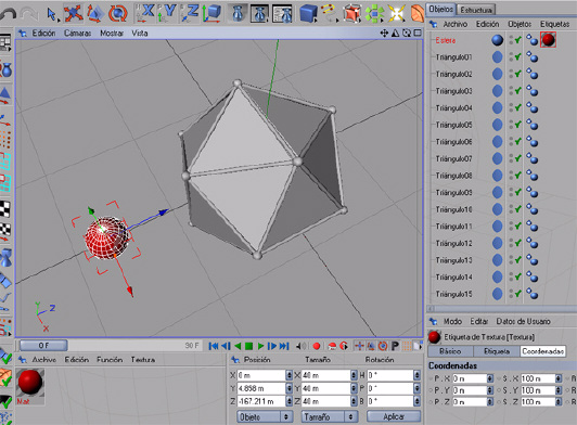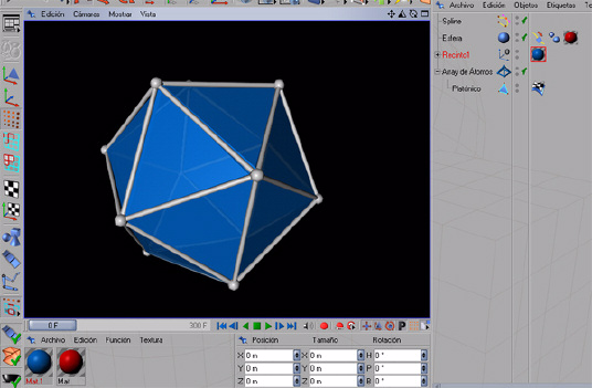 nota: si queremes hacer una escena más simple, sirve perfectamente tomar el tipo = tetraedro, que al tener sólo cuatro caras, será mucho más rápido de modelar que con el icosaedro de 20 caras. El principio del procedimiento es el mismo y, una vez entendido cómo funciona para un tetraedro, lo podremos aplicar usando un octaedro o icosaedro, que son poliedros regulares cuyas caras son todas ellas triángulos equilateros.