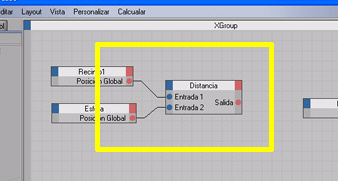 Añadimos un nuevo nodo, botón derecho dentro de la ventana Xpresso: nuevo nodo > Xpresso > calcular > distancia, luego enlazamos los puertos rojos de posición global a los puertos azules entrada1 y entrada2, según la figura.