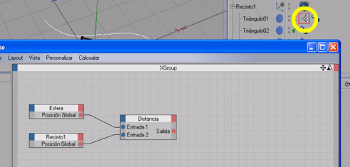 Hacemos clic, con el botón izquierdo, dos veces sobre la etiqueta Xpresso anterior y, en la ventana que se abre, arrastramos los objetos esfera y recinto1, creamos los puertos posición global en cada uno de ellos, seguidamente añadimos un nodo distancia, y enlazamos los puertos según la figura.