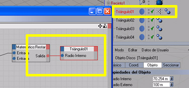 Al nodo triangulo01 le añadimos un puerto, clic cobre el cuadrado azul: propiedades del objeto > radio interno, y unimos los puertos salida (del nodo matemático) con radio interno (del nodo triangulo01).