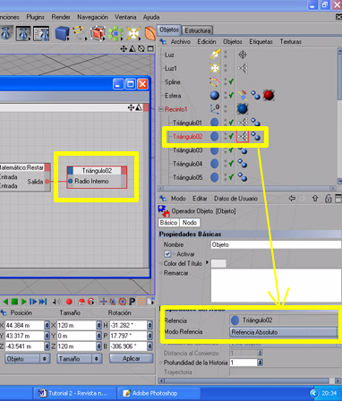 Es necesario modificar la etiqueta para que funcione correctamente respecto del triangulo02, para ello seleccionamos la etiqueta, dentro de la ventana Xpresso, debiendo estar seleccionado también el objeto triangulo02 (estar en color rojo el texto), y arrastramos la palabra triangulo02 dentro del campo referencia.