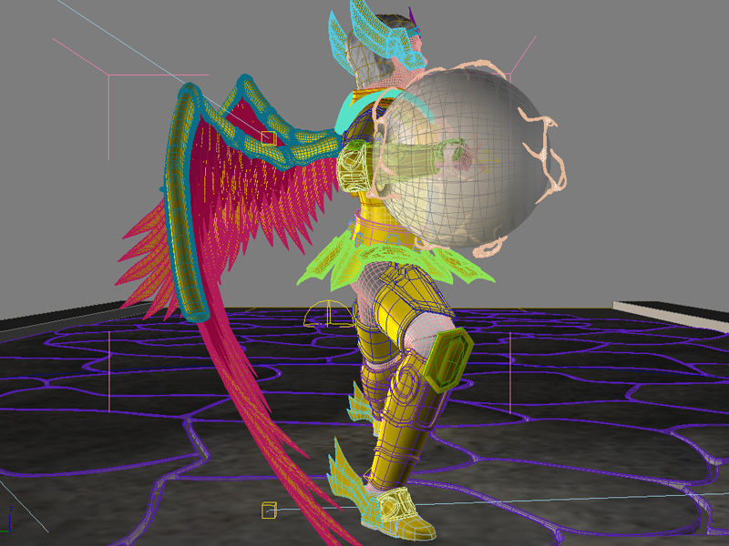 El cuerpo del caballero esta iluminado principalmente por una luz blanca desde el rayo atómico y por una luz principal ligeramente amarilla desde la espalda. De esa manera hay una línea divisoria más oscura por el centro de la cara. Luego, la armadura tiene luces adicionales exclusivamente para ella para poder resaltar sus brillos y que parezca más mágica. Y alguna luz amarilla extra para que el suelo se iluminara por el cosmos y el brillo de la armadura. Lo demás es relleno. Otra cosa no se me ocurría. Por cierto, no sé si os habréis dado cuenta, pero la posición del sol es casi opuesta a la de la luz principal. Es que la parte del sol creaba mejores reflejos y por eso desafié las leyes de la naturaleza. El frontal era lo que más tenía que lucir pues iba a ser lo más visible.
