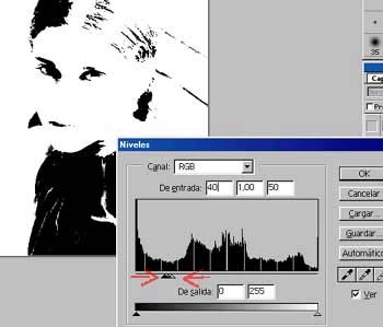 Empezaremos por la capa superior luces. Seleccionamos la capa y abrimos el ajuste niveles (imagen/ajustar/niveles Control + l). En esta capa debemos conseguir la luz fuerte de la fotografía y una buena silueta de luz en la que se aprecien, con buen detalle, los ojos, la nariz y la boca, al igual que otros detalles adicionales, pero siempre dejando un efecto de muy alto contraste manejando las manecillas del efecto niveles siempre muy juntas. Si os fijáis se parece mucho a la forma de iluminar de algunos cómics. Los valores que he usando ahí pueden variar dependiendo de cada imagen. Una vez aceptemos el ajuste, bajamos la opacidad de la capa a 80% y le cambiamos el modo a trama.