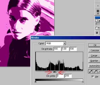 Y seguimos el mismo método de niveles (imagen/ajustar/niveles Control + l) ahora os habréis dado cuenta de que se ve el resultado en tiempo real a medida que jugamos con los niveles. El mejor resultado que podemos dejar es el que complete la imagen añadiendo un nuevo tono que defina la forma y facciones de la cara, y lo más importante, que quede bonito.