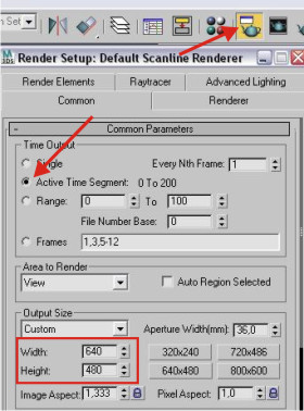 1.- Ahora entremos a las opciones del render setup, dentro de la ventana activamos el tiempo total de animación en mi caso es de 0 a 200, entonces activo la opción que dice active time segment: 0 todo 200, también puedo definir el tamaño de la imagen o video en la pestaña output size.