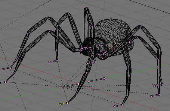 El esqueleto resultante debería permitirte darle posturas a la araña de una forma sencilla. Tan sólo necesitas mover uno de los huesos objetivos IK para mover una pata. Además, puedes mover la cabeza y las patas la seguirán apropiadamente. Incluso puedes elevar el piso (hueso flor) o mover el hueso root para mover la araña. Ahora podemos esconder los huesos que no nos servirán para una cierta animación. Para ello, escoge todos los huesos que no vayas a usar cuando animes, y presiona [h]. El resultado puede ser semejante a esto: