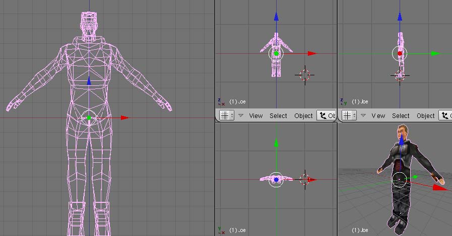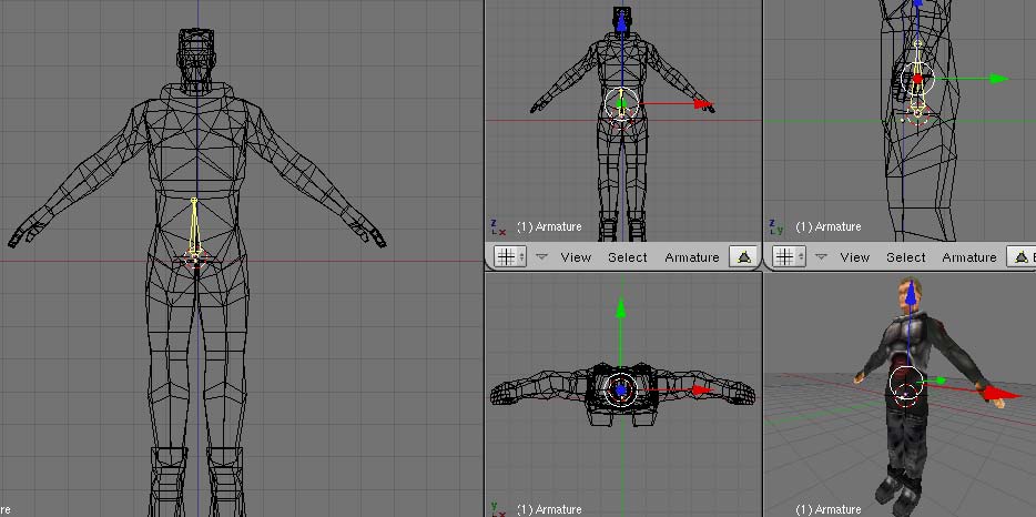 Como siguiente paso asegúrate de que el cursor esté centrado en el área pélvica de joe desde las vistas frontal y lateral. [barra espaciadora] add>>armature. Esto creara una nueva armadura o sistema de huesos para nuestra malla joe. Deberías tener algo muy similar a la imagen siguiente.
