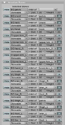 Ok, ahora que la disposición básica de nuestro sistema de esqueleto esta completa es el momento de emparentar y nombrar ciertos huesos entre sí para crear una jerarquía. Estando aún en modo de edición para los huesos presiona [f9] para que aparezcan los botones del modo edición (en caso de que no estuvieran ya ahí). Busca armature Bones>> selected Bones en la ventana de botones. Asegúrate de seleccionar todos los huesos con [a]. Para hacer la explicación más sencilla haz coincidir el nombre de tus huesos (Bones) y padres (parents) con los de la imagen siguiente. Observa, que es una típica convención de notación agregar _r o _l para cada hueso derecho (right) o izquierdo (left) respectivamente.