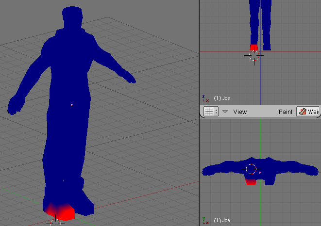 Recapitulando hasta este punto, hemos añadido nuestro objeto joe a la escena, hemos creado una disposición básica para nuestro sistema de armadura humanoide, y hemos asignado el nombre y el ancestro (o padre) de nuestros huesos. A continuación asignaremos grupos de vértices al sistema de armadura por medio del proceso denominado pintura de pesos weight panting en inglés. (ver cuadro).