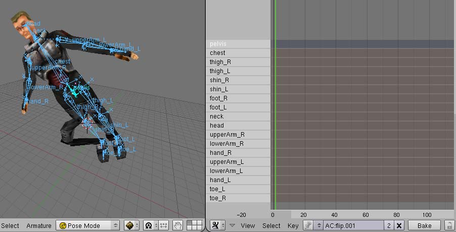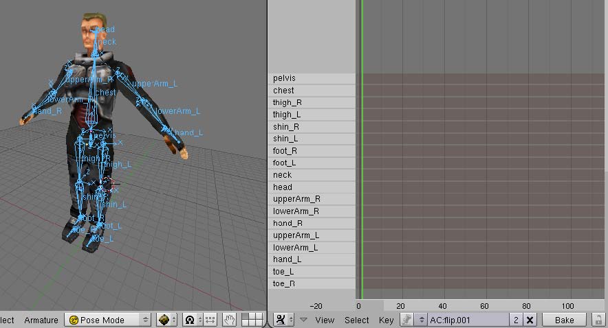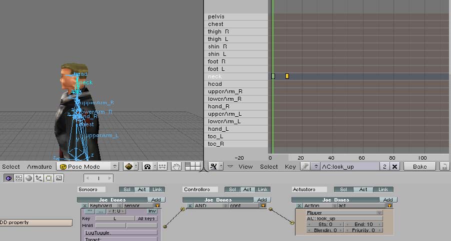 Una vez hecho esto y con el cursor sobre la vista 3d, presiona la tecla [p] y después [enter], ignora el mensaje de error (no correct) de la cámara. Si hiciste todo correctamente, deberías poder presionar y sostener la tecla [l] haciendo que el personaje mire hacia arriba. Como práctica puedes crear otras animaciones: agitar una mano o un ciclo de marcha.