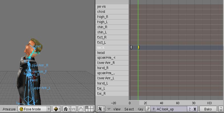 Rota el hueso del cuello unos 30 grados (haciéndolo mirar hacia arriba) e inserta otro cuadro clave como hiciste antes. Regresa al cuadro número 1 presionando la tecla [flecha hacia la izquierda del teclado numérico] y presiona [alt-a] en la vista 3d. Si lo hiciste todo correctamente, deberías ver la malla mirando arriba hacia el cielo. Ver la imagen.