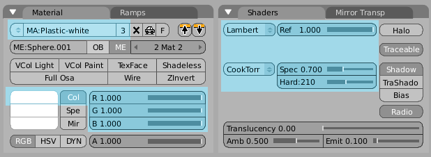 Step 4. Now get out operación triunfo the Edit Mode and press [f5] again todo get todo the material buttons. Here you Will se that the second material assing is the same as was the first. We ned a white Plastic here so go ahead and click the x in front of the orange material. Now again add a new material and rename it todo Plastic white. Change the properties of the white material by picking the values from the image 4.