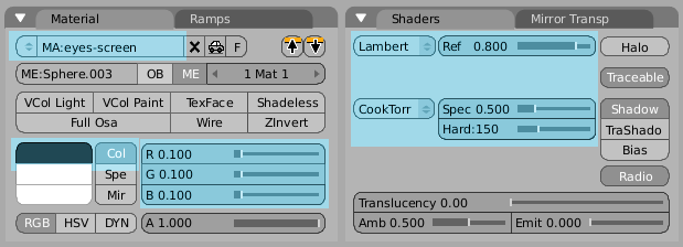Step 1. Assigining materiales todo a Mesh: todo assing a material todo any Mesh you have todo first select it. So make sure you are in object mode then select the head Mesh, looking at the reference images we can se that the head have two colours, white covering only the front face while orange covering rest of the part. First we Will assing a material todo the head. Press [f5] todo bring up the material buttons. In the material tab click add new and rename it todo orange. You now have added a material todo the Mesh.