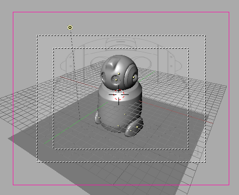 Step 7. Using a Camera: since we have use the default scene we already have one Lamp and a Camera assigned. Now we Will position the Camera. To get in todo the Camera view press [Numpad 0]. Here you can se thre frames first one is the capture frame second one is the safe frame the third one is actualy the Camera itself. Right click the out most frame and predd [g] Grab now if you move your mouse you can se the Camera moves. Try todo positon the Camera as sen in the image 7.
