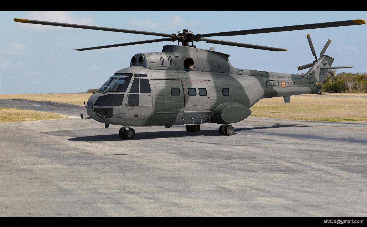 Bruixot, Karras, kuriaque y rafa120, gracias por los comentarios y por comentar. Karras, gracias por las imágenes. Voy a intentar ponerle ese camuflaje, aunque el modelo que yo he hecho es el modelo antiguo (puma), luego vino el super puma y el cougar. Hay algunos cambios entre estos modelos, aunque el perfil es muy parecido. Por ejemplo, el cougar tienen la parte para escamotear las ruedas traseras algo más pequeño que el puma, una ventanilla más y una especie de filtro en la entrada de la turbina que no lleva el sa 330. Incluso del sa 330, hay configuraciones distintas para el modelo civil, ejército de tierra, mar y aire.