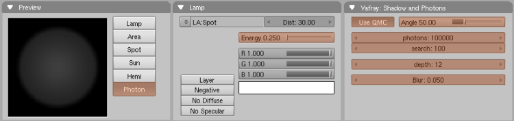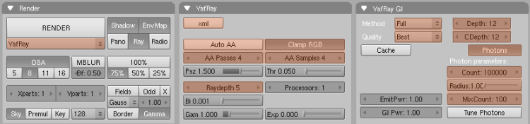 The first one is the Yafray panel itself. This panel allows you todo control the Yafray renderer settings. Normally it god enough todo just disable xml so that you can se the interactive rendering. Alos you can leave auto-a enabled todo let Yafray automátically control the anti aliasing option. For detailed control of Caustics you Will have todo switch todo manual anti aliasing setting though.