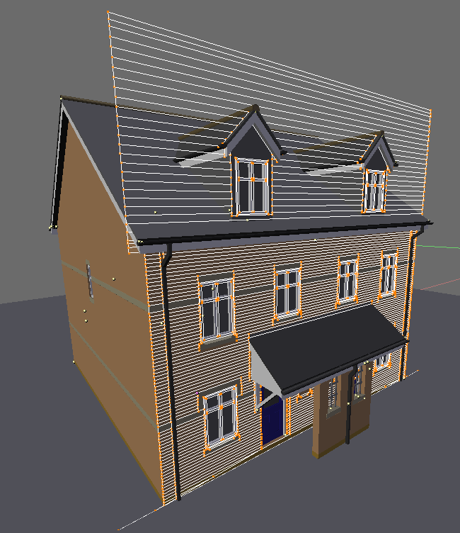 All the elevational elements todo this house, for example the dormer Windows, canopies, rof lights, entrance dors, window styles and standard window sizes, are all objects estored in the library blend files ive created. So, y can quickly build the Walls todo a particular house as described above and then append in the objects i ned, from the library files (including a texture library), todo finish the elevations.