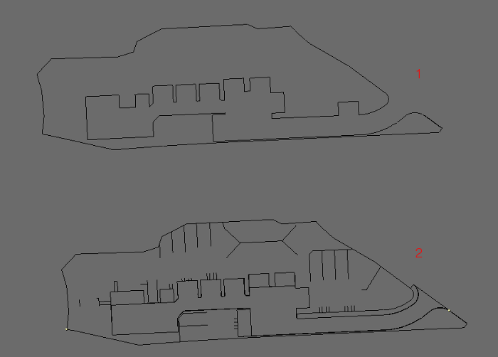 You can model the basis of a hola for the site, on which you intend putting the buildings, in the same way. Import a cleaned up 2d dxf of the site survey, having first defined the perimeters in the CAD file for the various hola elements like the site Boundary, the área todo be planted and turfed, the outline of the roads and fotpaths. Then use the mesh2curve script on each of those perimeter lines todo convert them todo closed curves, giving you solid infill todo your defined áreas. Mesh (1) below is the perimeter for the landscaping. Mesh (2) was a full site import, but i have ben moving the meshes Edges onto the final site model and then modeling into 3d. The final site model was based on the curves generated from Mesh (1) by the mesh2curve script.