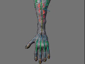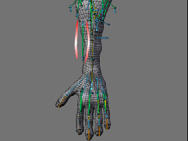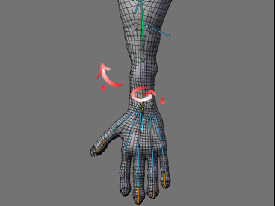 In this example we can se the arm. The basic structure consists of two Bones, upperarm and forearm. As you may know, this Joint can have two diferent kinds of movement, the Bending one and the twisting one. The deformation of the twisting movement is easily solved with some extra Bones placed along the upperarm. These Bones follow the rotation of the forearm gradually. The closer todo the forearm the more influence they get from its rotation. This way, the twisting bone that is at the shoulder point has practically no influence from the rotation of the forearm.