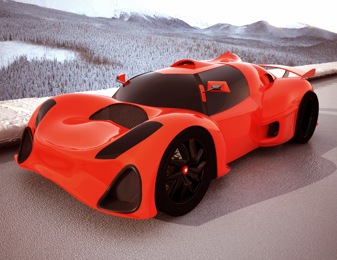 Tras hora y pico haciendo pruebas y hora y media de render os muestro el coche en un entorno helado. He cambiado el material naranja del coche de Blinn a Phong, parece que va mejor, pero creo que tendré que ponerle algo de suciedad puesto que el coche se ve irrealmente nuevo.