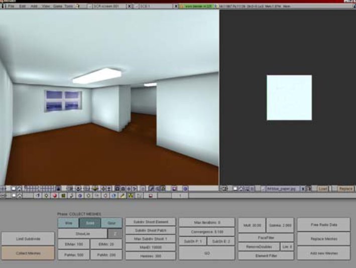 Para la iluminación de una escena en Game Engine, se utiliza una técnica llamada radiosidad, ya que a diferencia del modelado tradicional utilizado para la animación o el render (manejados también por Blender), donde se utilizan lámparas para brindar iluminación y sombras, el Game Engine no reconoce ese tipo de iluminación, por lo que al aplicar radiosidad a la escena, Blender pinta cada una de las caras generadas por esta iluminación por medio de emisores de luz, a modo que al final dan la impresión de estar iluminadas por alguna fuente de luz, aunque esto es de modo permanente, es decir, durante el recorrido no podremos modificar la dirección de la iluminación o modificarla en alguna otra forma. La radiosidad funciona a través de uno o varios objetos que se comportaran como emisores de luz, a los que se les aplicara material configurado especialmente para ser emisores, permitiéndo con esto, al iniciar el proceso de iluminación, calcular las caras que la escena deberá tener, y con que nivel de iluminación deberán contar en cada punto de la escena.
