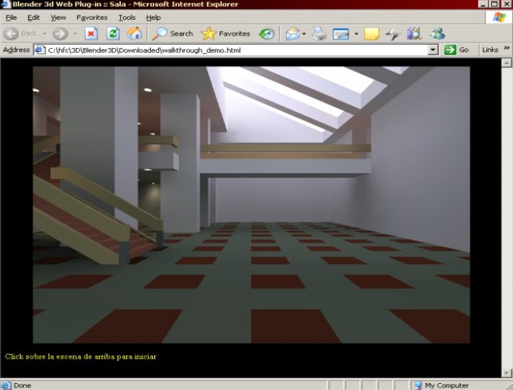 El 3d web plugin de Blender permite publicar nuestros trabajos de Game Engine en internet, permitiendo un mayor alcance de disposición al público. Para utilizar el 3d web plugin de Blender, se necesita escribir algunas líneas de código para generar una página html, que ejecutara el archivo. El 3d web plugin de Blender, también muestra el archivo con la resolución que se haya indicado, por lo que en caso de que se prefiera una resolución diferente, puede hacerse esta modificación, guardar el archivo, y abrir de nuevo o recargar la página html para ver el cambio. Para poder iniciar el recorrido en el 3d web plug in, será necesario dar un clic sobre la escena, para pasar el control del teclado y/o el mouse al plug in.
