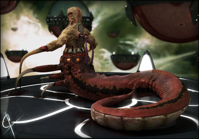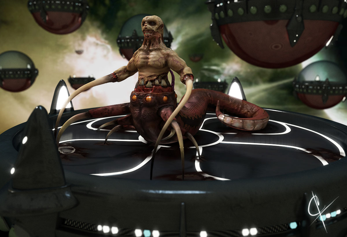 Modelado de monstruo humano mutado y el monstruo alien con Autodesk Maya, siquiente esculpido en ZBrush a alto detalle poligonal y creado mapas textura, displacement, Normal Bump, ss, reflejo, glossiness en ZBrush, finalmente a Maya con intentos de crear el Shader de piel realista, pero al final acabe.