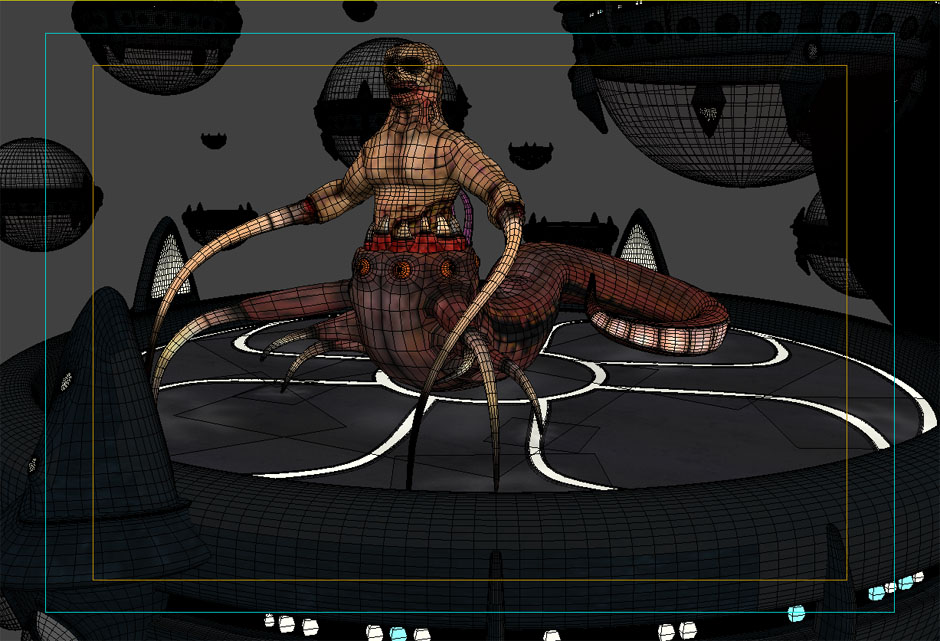 Ilustración (boceto) -> modelado (Maya) -> esculpido (ZBrush) -> mapas texturas (ZBrush/ps) -> modelado entorno (Maya) -> render (3ds Max) -> composición (Digital Fusion/ps)