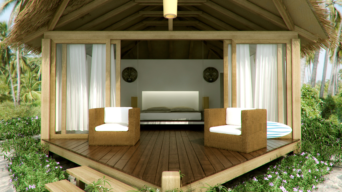 Man me gustó tu render nada más creo que fallaron un par de cosas, el mimbre de las sillas utiliza un tono más claro para que contraste un poco, el fonto y las plantas se ven raras, pero lo que me encanto es la madera de la cabaña, y el techo tipo palapa, saludos.