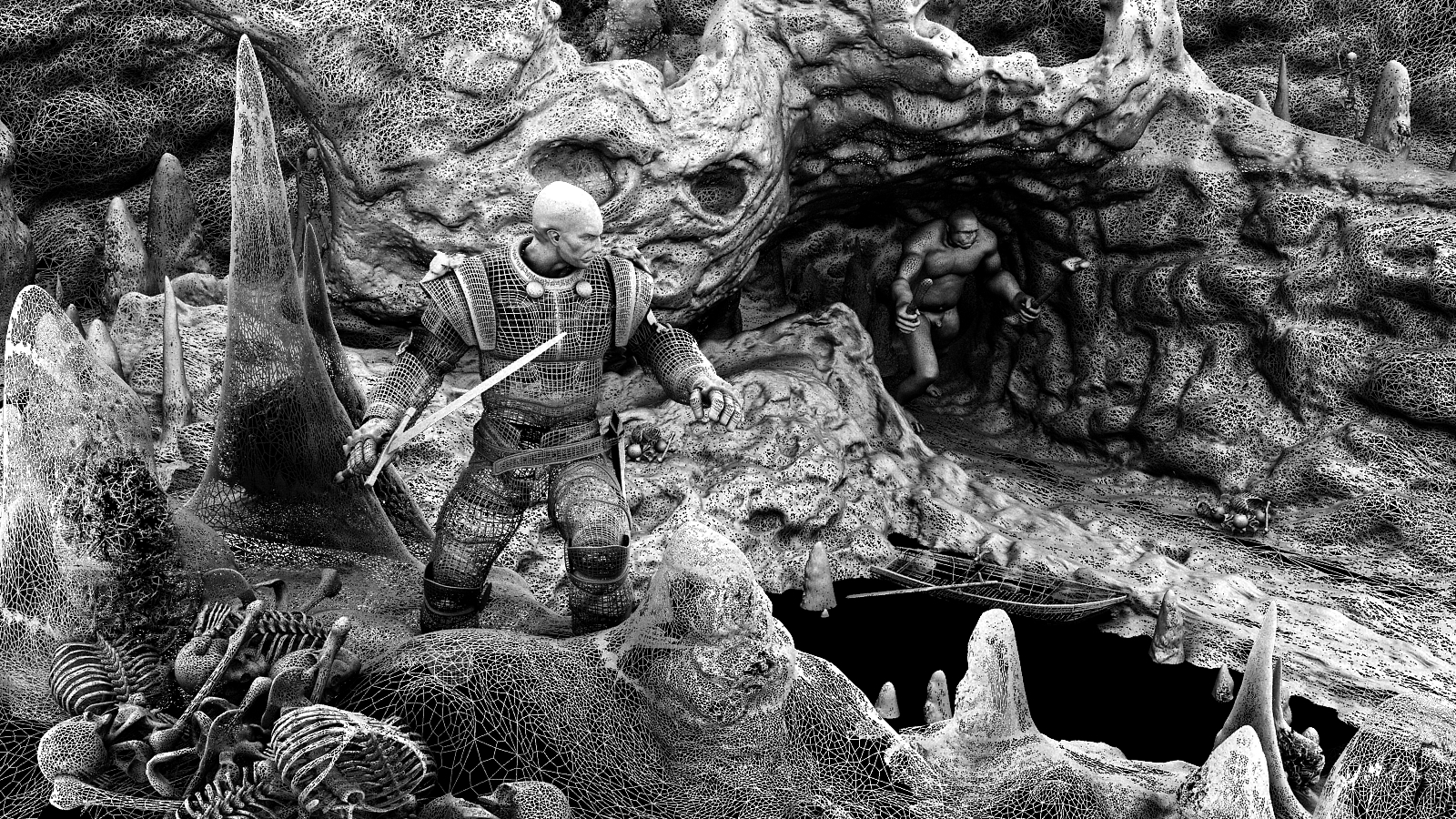 El wire es impresionante, me gusta mucho cómo queda la cueva y las rocas en el render, pero cómo queda en el wire, guau, parece una fotografía de algo visto al microscopio electrónico.
