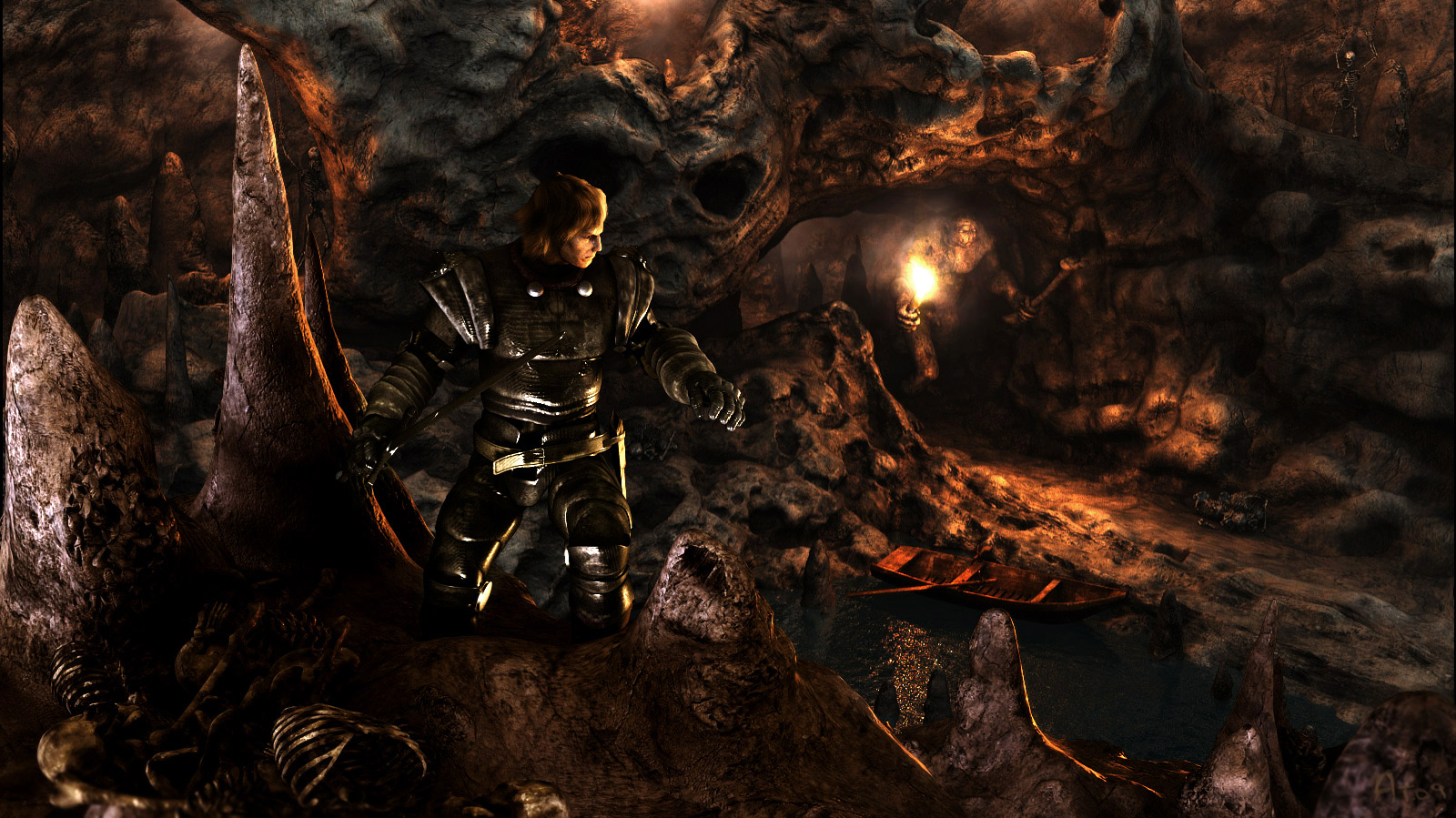 Esta que se sale. Podrías también poner un wire. Igual iluminaria un poco más al caballero, añadiendo delante del una luz, o aclarando alguna capa del Combustion o el After, en un vistazo rápido esta tan en penumbra que no se le ve que lleve una espada, luego si te fijas más si se le ve.