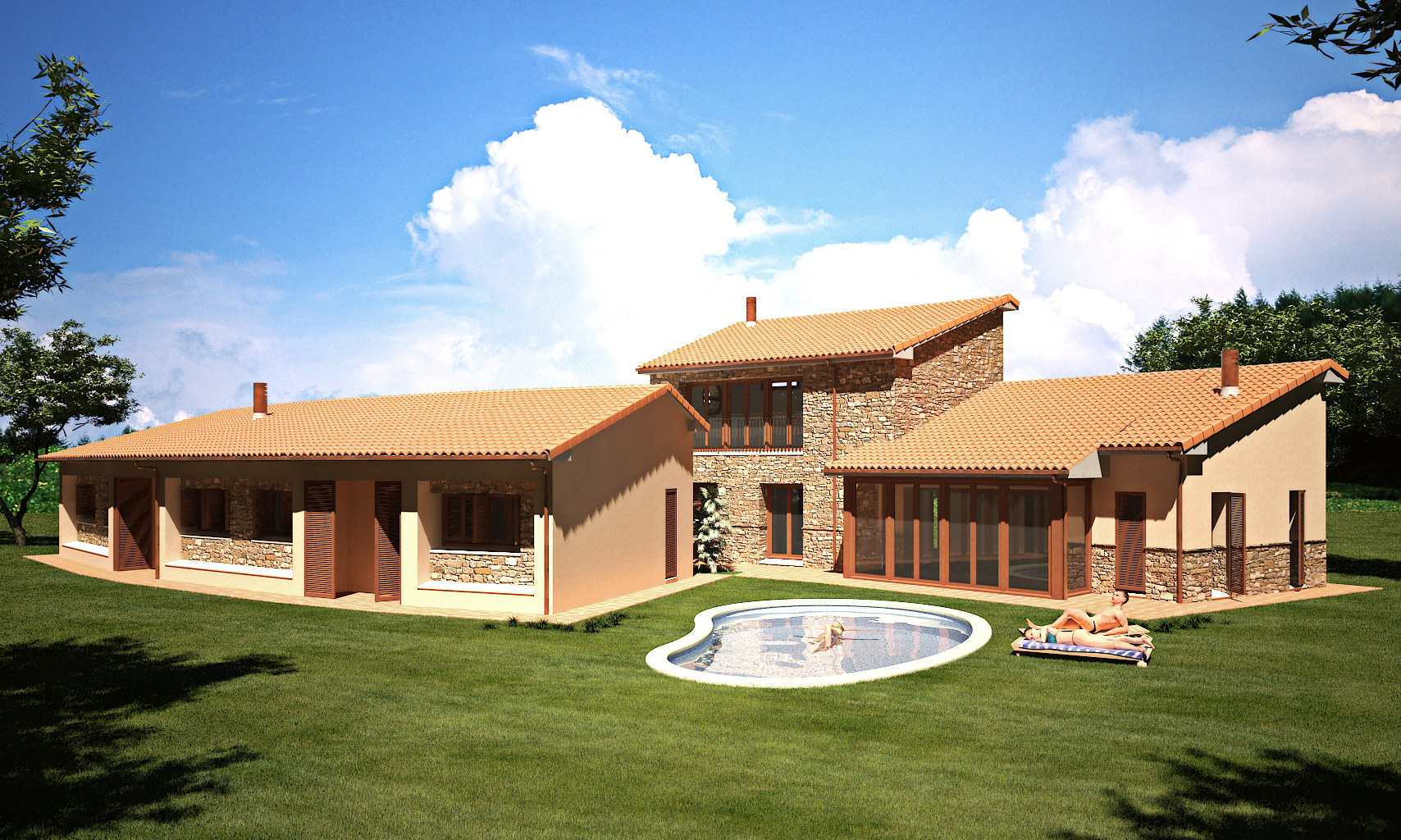 Hola, se ve bien, me gusta la iluminación, para mí esta conseguida, lo único que veo un poco raro es la escala de la chiquita que está en la piscina, comparado con las dos personas que hay tumbadas se ve fuera de escala, también hay una cosa en la cubierta de la derecha, parece que no coinciden las tejas y se ve algo raro. Un saludo y buen trabajo.