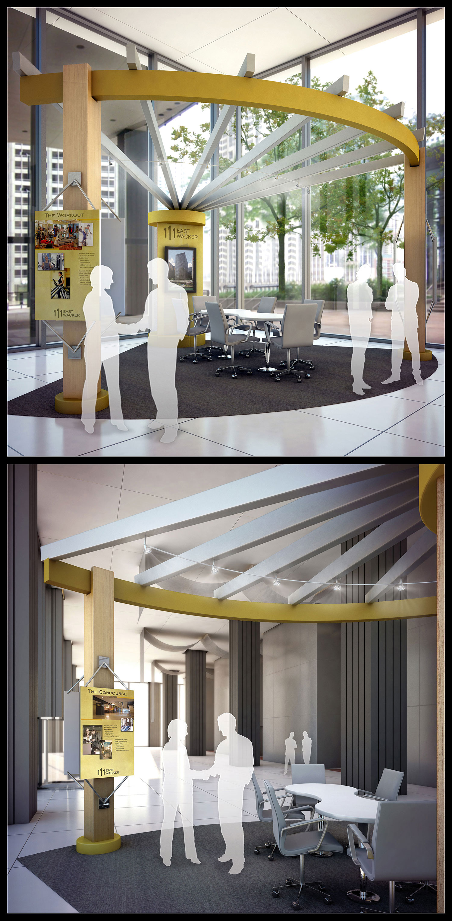 Hola. Este trabajo es de la compañía donde trabajo, diseñaron esta especia de stand para presentaciones de proyectos en un edificio del centro de la ciudad aquí en Chicago, algo raro por cierto, al estar ahí en medio de todo y todos.
