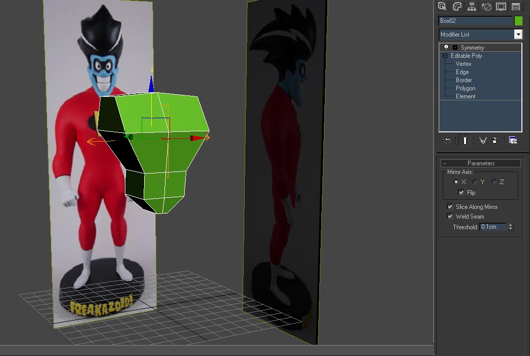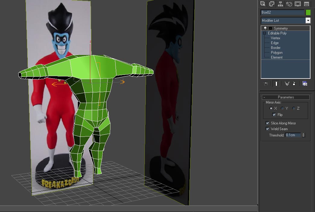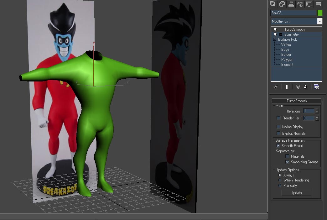 para empezar ubicamos las vistas del personaje gracias a Dexter por estas espectaculares referencias, creamos una caja (box), luego aplicamos el modificador de simetría, imagen 1. Ahora empezaremos a extruir la caja para dar el volumen, imagen 2.