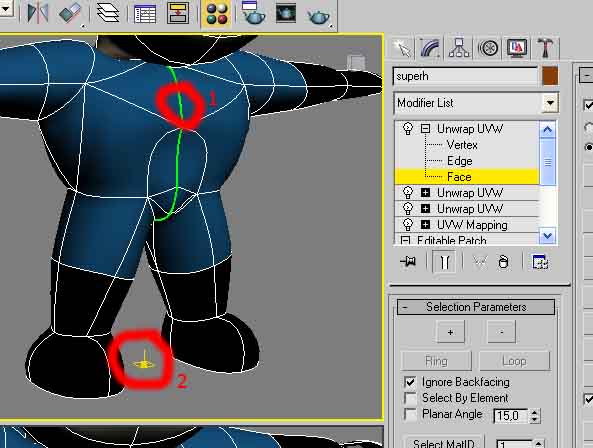 Hola. Estoy aplicando el modificador Unwrap UVW a mi modelo (hecho en patch) y tengo un problema: Cuando apliqué el modificador por primera vez, me aparecieron algunos lados pintados de verde que encerraban una sección abierta (no había una superficie en ellas) y en base a esas líneas de verde, empiezo a mapear mi modelo.