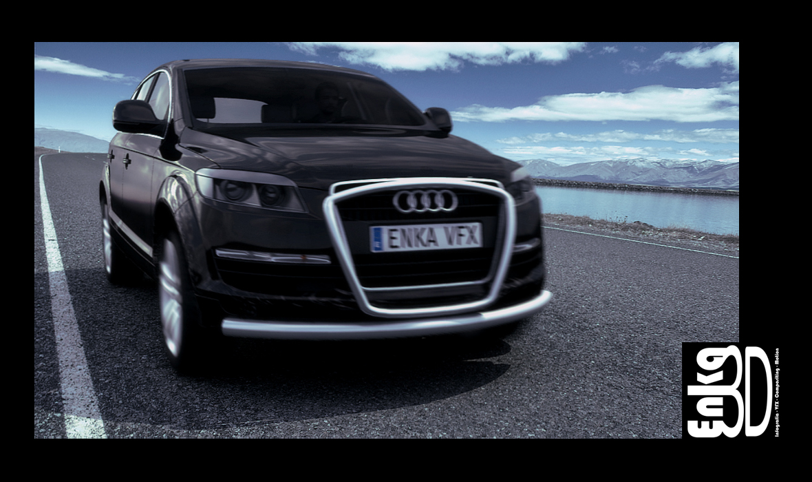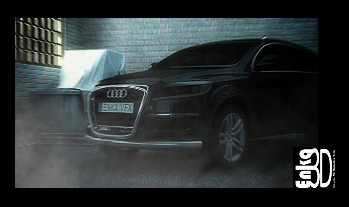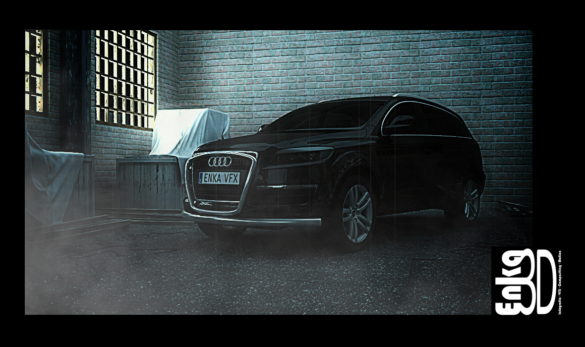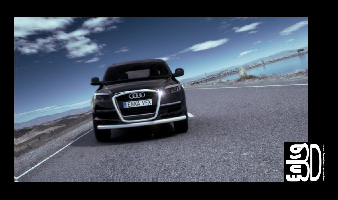 Muy buenas a todos/as compañeros/as, me complace presentaros mi último trabajo personal Audi Q7 VFX 2.0. Este trabajo empezó siendo un encargo real de una productora cuyo nombre no quiero recordar, esto tenía que a ver sido un spot para la web oficial de Audi, pero para la promoción del q5, después de marear la perdiz y realizar un montón de story boards y alguna que otra animática (como 1 mes trabajando.) resultó que no había presupuesto y que se iba a encargar toda la publicidad desde Alemania o eso es lo que nos contaron, en fin, el tema se cancelo y seguimos con otros asuntos como es lo normal, pero claro uno que ha nacido freake (que le vamos a hacer), pues decidí retomar el proyecto personalmente e intentar realizar el spot yo solo y en horas fuera de trabajo (es decir a ratos por las noches y algún fin de semana de resaca mensaje party.) en total he estado liado unos 4 meses, pero claro computo real de horas no sabría decir exactamente, pero creo que si hubiera dedicado 8 horas diarias de l a v pues quizá un mes o menos.