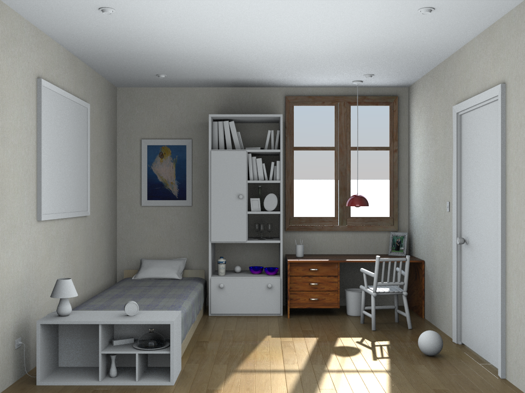 Hola slash148, ahora también es el mejor momento de iluminar, ten cuidado donde pones las luces, ya iremos viendo el cambio de la escena. Yo pondría algún cuadro más pequeño en las paredes y una papelera, saludos.