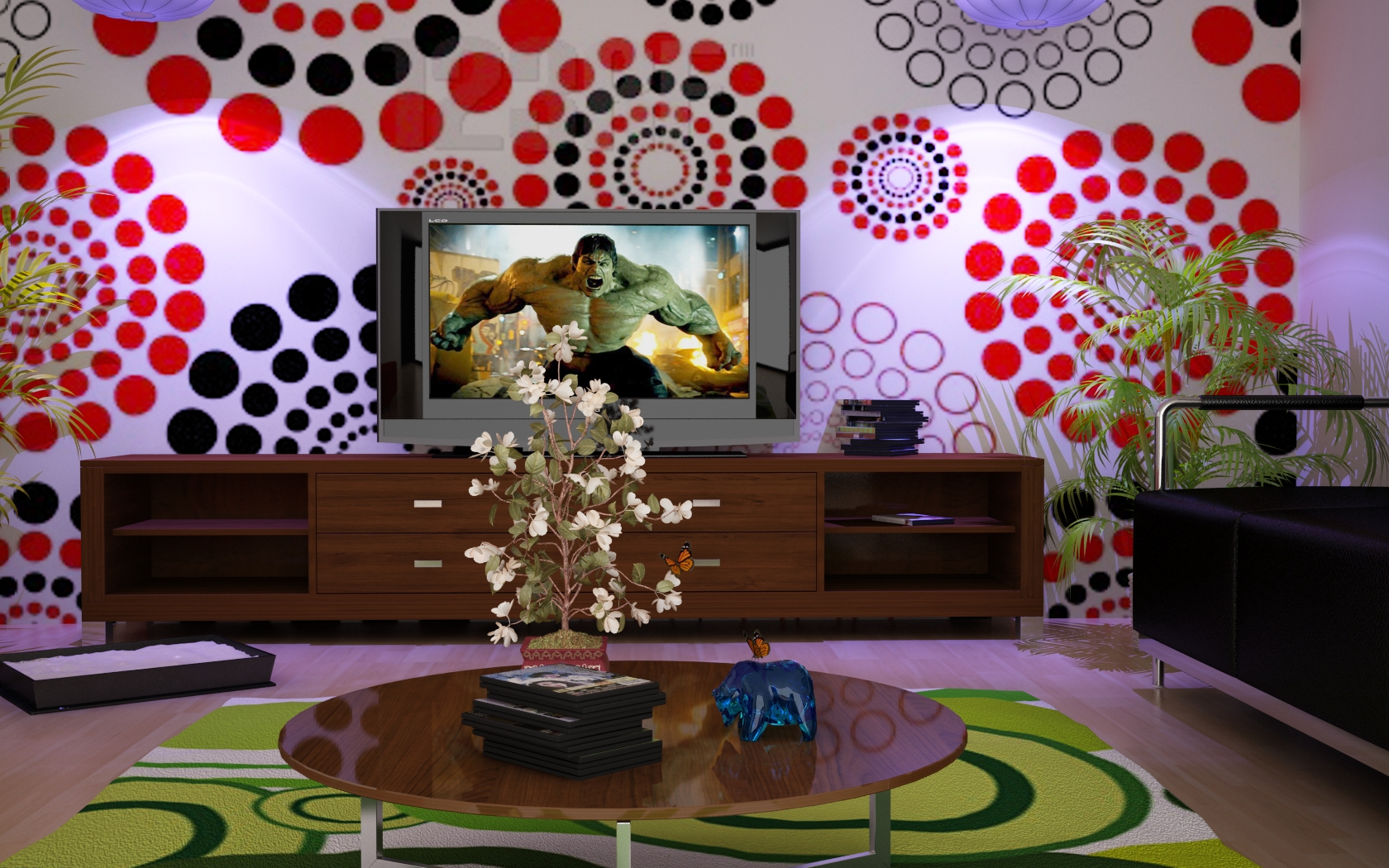 Vaya el fondo efectivamente duele, tiene una marca de agua ¿no? O es de la imagen? El resto está bien, aunque hay otras cosas que son raras, el Bonsai con las mariposas muy poético y detrás el bicho verde.rara composición.