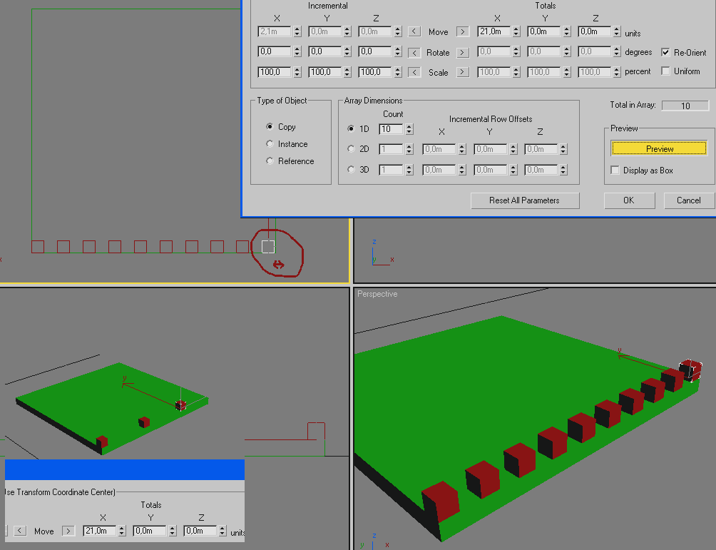 Cojo la box (estando el gizmo en local, en el centro del cubo pequeño) y hago un array de 10 cubos a una distancia total de 21 m.