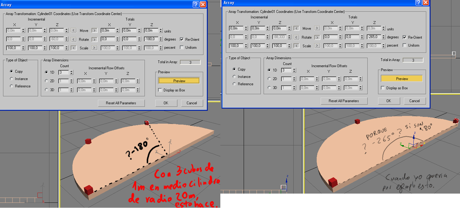 Es un array de un cubo de 1mx1mx1m, el otro cubo lo he puesto como referencia de que ese lado, cara mide 20m. Otra cosa parecida que tampoco entiendo, un array de un cubo haciendo 3 copias y a -180 grados, teniendo como gizmo, el centro del medio cilindro.