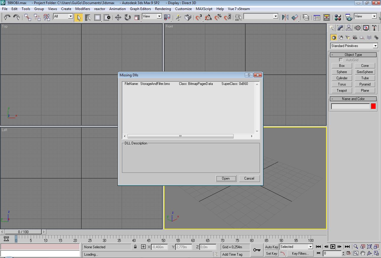 Como prueba a ver si se solucionaba el problema, la librería que da fallo (storageandfilter, bms), la copie de la carpeta de 3ds Max 2010 a 3ds Max 9 y como resultado obtuve una catástrofe en 3dsmax 9 y tuve que volver a reinstalarlo.