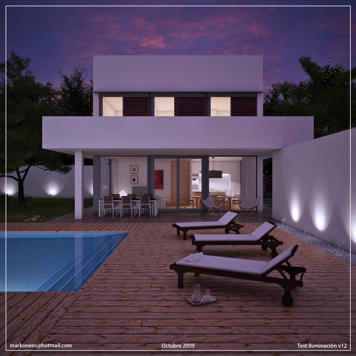 Se trata de una escena nocturna y su antitesis con luz diurna. Nada poca cosa, sólo el mero hecho de practicar con diferentes iluminaciones en Vray. Ya sabéis Vray Sun y sus movidas.